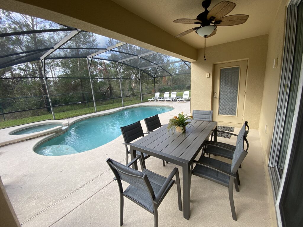 Outside is a covered lanai with ceiling fan and south facing pool with spa, which backs onto beautiful conservation area. There are 4 sun loungers and a table with 6 chairs.